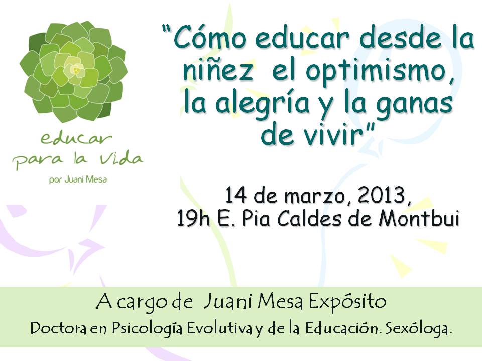 El próximo jueves 14 de marzo impartiré un taller de 3 horas para familias en la E. P. de Caldes de Montbui. Lo he titulado, «Cómo educar desde la niñez, el optimismo, la alegría y las ganas de vivir». Hablaré del optimismo, de las emociones que traemos en nuestro «paquete genético», de la tolerancia a la frustración, de la generación de objetivos, de tener unos buenos valores morales y unos padres que nos den un buen ejemplo.¿Alguien se anima? Si fuera así, previamente tendrán que ponerse en contacto conmigo para trasladar las solicitudes al AMPA del centro escolar que es quien lo organiza. Como siempre, el número de plazas es limitado.