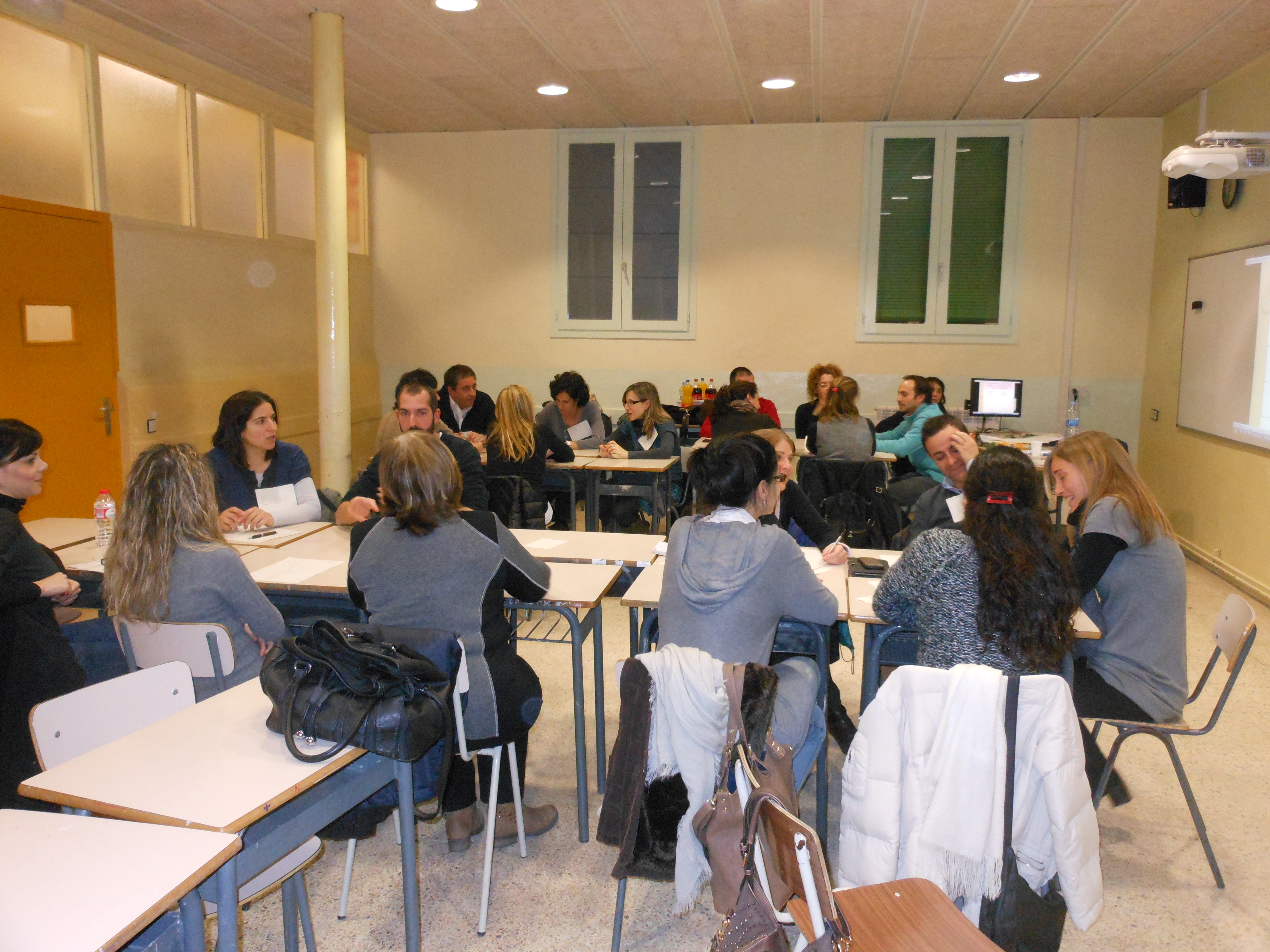 Familias trabajando en grupo en un taller de Autoestima en un centro escolar de Sant Boi (Barcelona) impartido por la Dra. Juani Mesa Expósito.